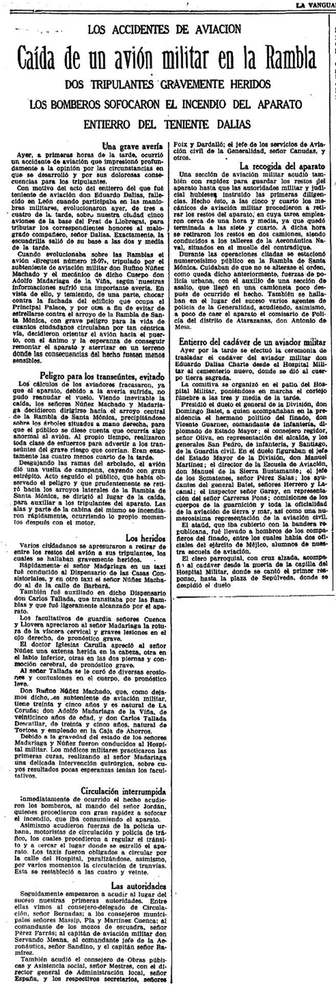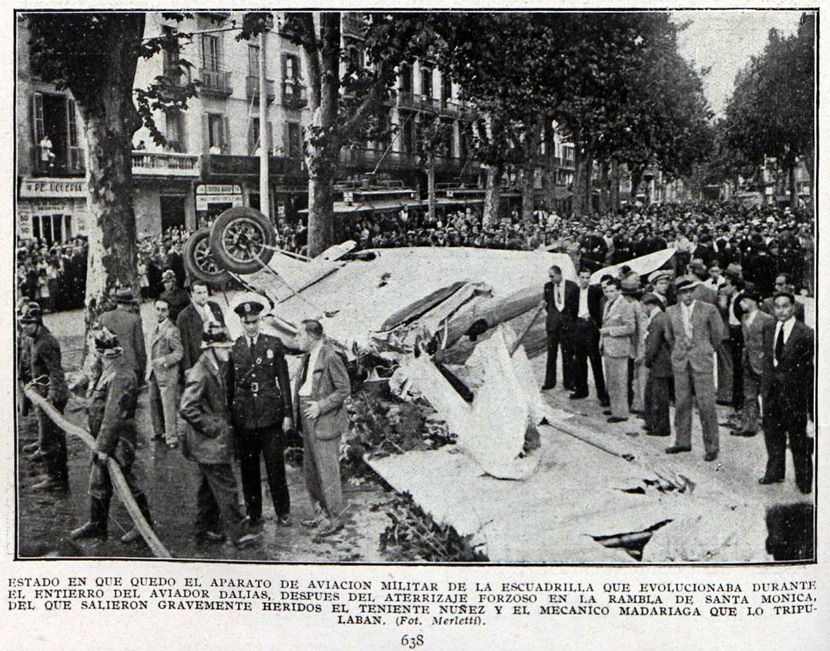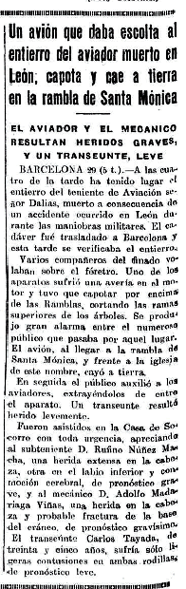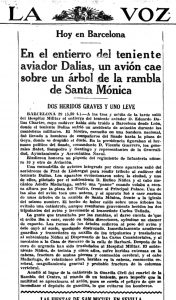 Una escuadrilla de aviones integrada por cinco aparatos salió del aeródromo de Prat de Llobregat para rendir tributo al cadáver del teniente Dalias. Los aparatos evolucionaron sobre la ciudad, y uno de ellos, pilotado por el subteniente D. Rufino Núñez y el cabo mecánico Adolfo Madariaga, sufrió una «panne» cuando volaba a escasa altura por la plaza del Teatro, frente al Principal Palace. Una de las alas del avión tocó una antena, y el aparato fué a caer encima de unos árboles de la rambla de Santa Mónica, frente a la iglesia del mismo nombre. El hecho de haber caído sobre unos árboles ha evitado una catástrofe, aunque resultaron gravemente heridos los dos tripulantes del avión y levemente el transeúnte Carlos Tallada.