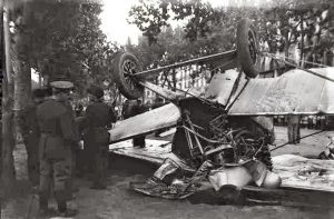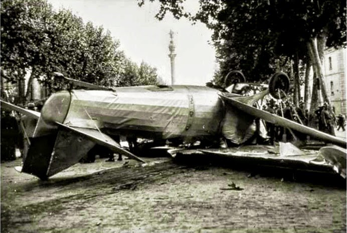 ESTADO EN QUE QUEDÓ EL APARATO DE AVIACION MILITAR DE LA ESCUADRILLA QUE EVOLUCIONABA DURANTE EL ENTIERRO DEL AVIADOR DALIAS, DESPUES DE ATERRIZAJE FORZOSO EN LA RAMBLA DE SANTA MONICA DEL QUE SALIERON GRAVEMENTE HERIDOS EL TENIENTE NUEZ Y EL MECANICO MADARIAGA QUE LO TRIPULABAN. (Foto Merletti)