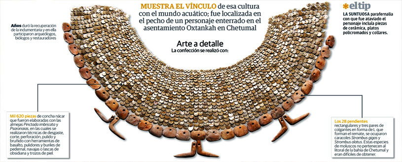 Hortensia de Vega Nova, directora del Proyecto Arqueológico de Oxtankah; el arqueólogo Emiliano Melgar Tísoc y la restauradora perito Lourdes Gallardo Parrodi, fueron los encargados del proyecto y en el curso de la investigación descubrieron que aunque la vestimenta tiene el aspecto de pectoral o collar, debido a que las cuentas estaban unidas en forma imbricada y con brillo sólo en una de sus caras, formaron parte de la indumentaria del individuo.