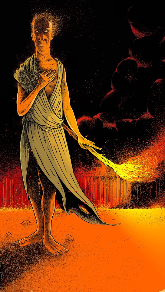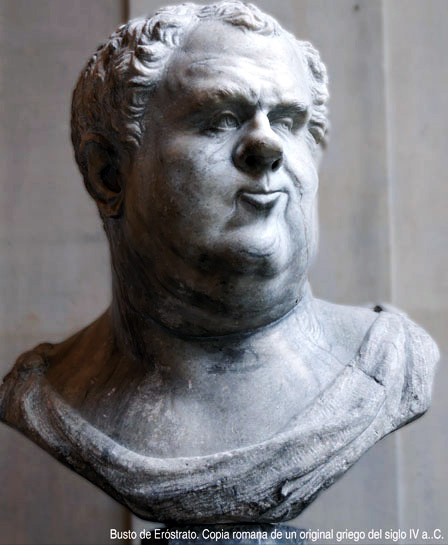 Agarró con su mano el preciado velo y rodeando el pronaos fue prendiendo fuego al cortinaje que no tardó en arder debido a la cantidad de aceites aromáticos que llevaba impregnados, el fuego alcanzó rápidamente los artesonados de ébano, ya todo estaba perdido. El fuego se enroscaba en los capiteles de las columnas de mármol abrasando la noble madera que contenía las enormes placas de oro consagradas en otro tiempo, las tejas empezaban a resquebrajarse y a caer desde lo alto hacia el interior del templo y en medio de esta grotesca escena, Eróstrato alzaba las manos y gritaba a los cuatro vientos: