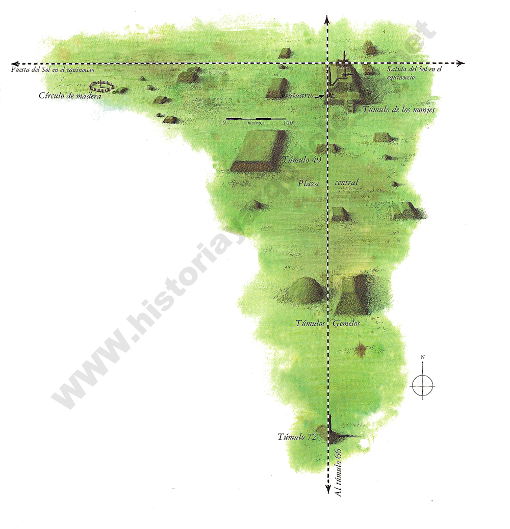 Mapa del complejo arqueológico de Cahopia, que muestra los túmulos más importantes, así como la disposición cardinal, al igual que la disposición solar equinocial.